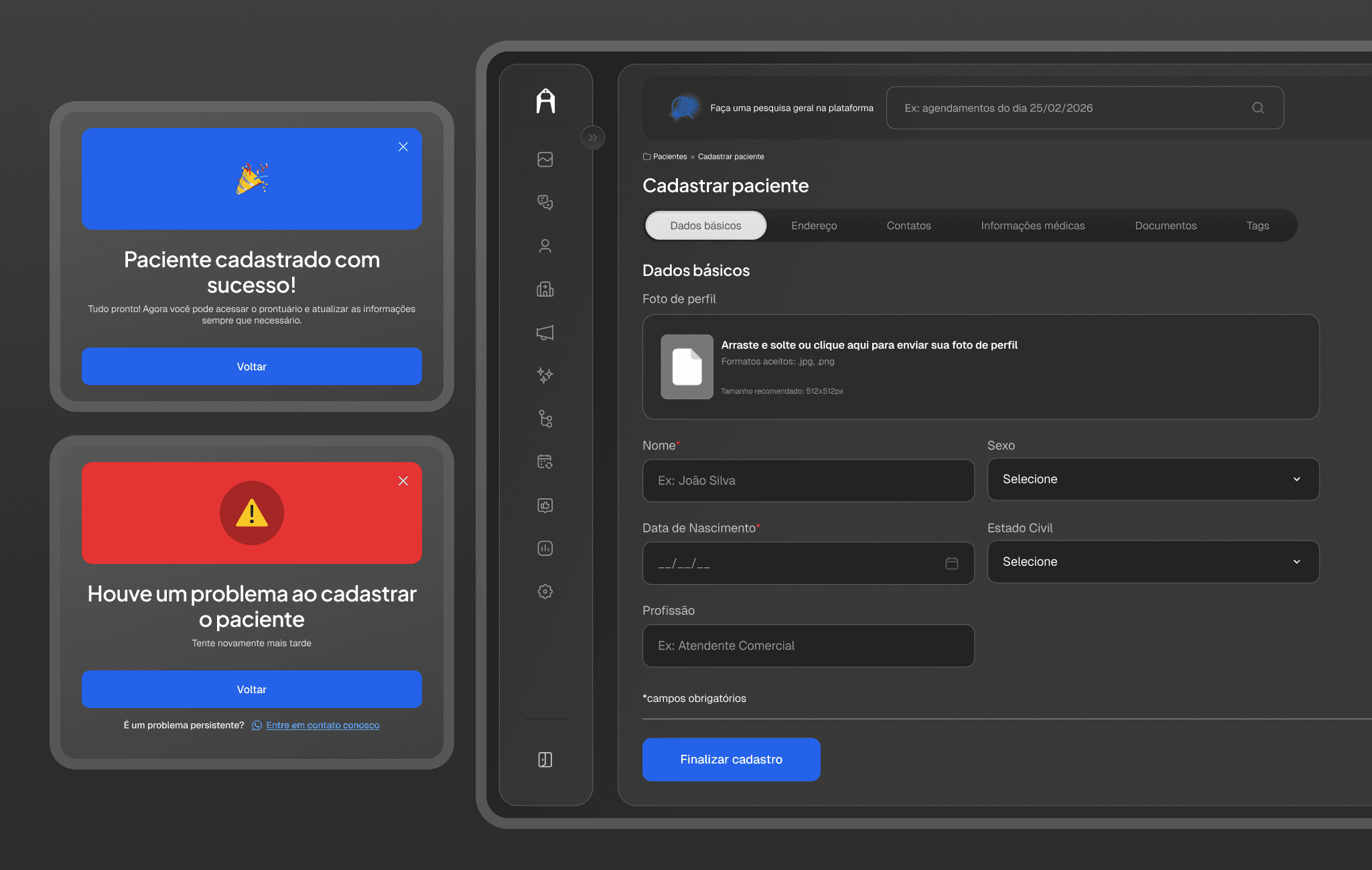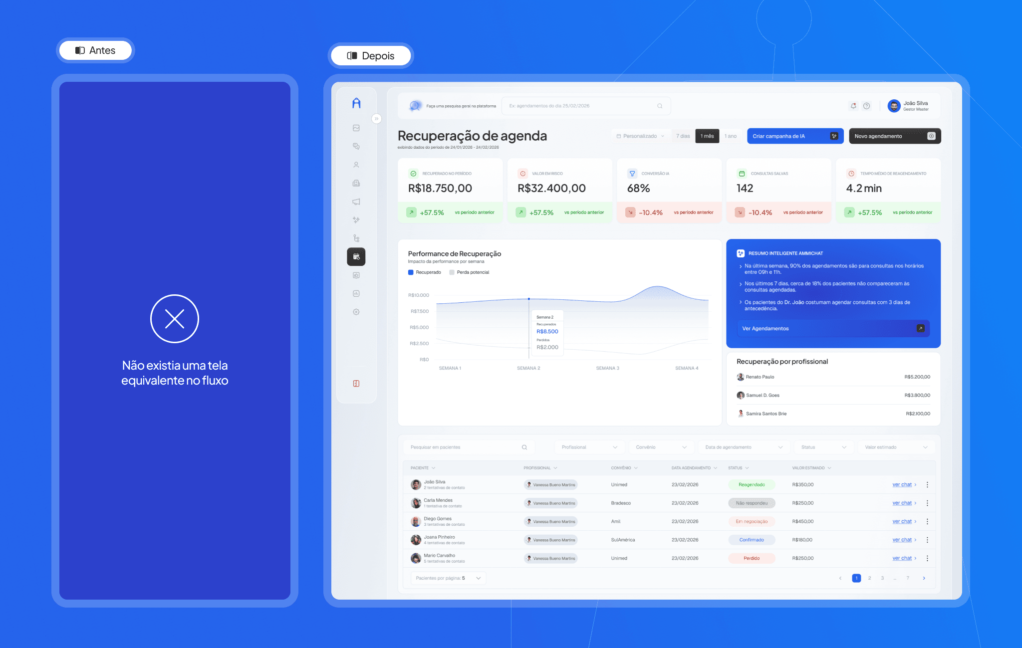 O primeiro tema foi o mais estrutural. Tudo que exigia sair do Ammichat para ser feito passou a existir dentro da plataforma: agendamento, histórico do paciente, informações do profissional, pós-atendimento e campanhas. A atendente deixou de ser uma pessoa que gerencia várias ferramentas para ser alguém que trabalha em um único lugar.
