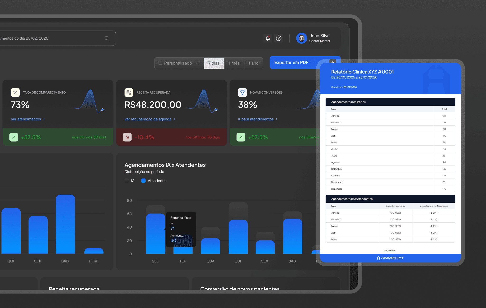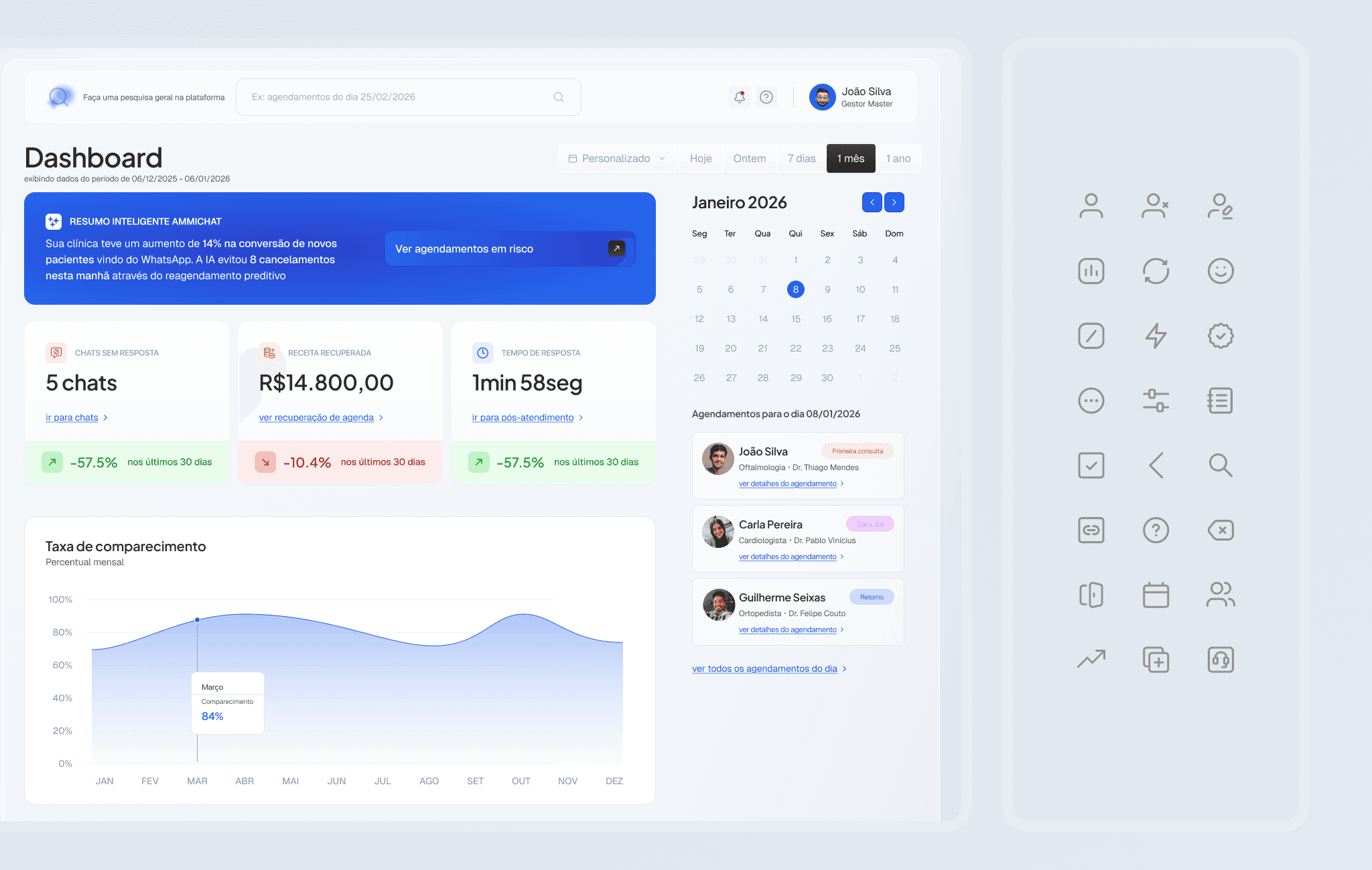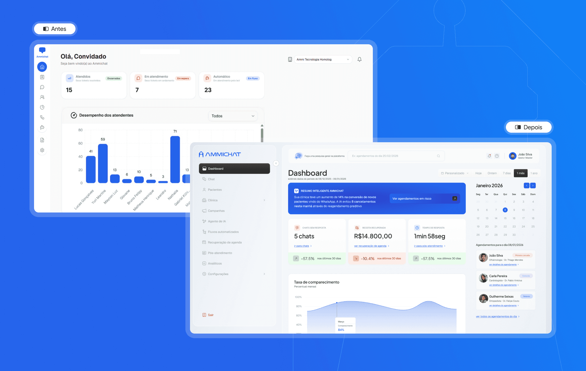 O dashboard foi redesenhado para antecipar, não só registrar. O Resumo Inteligente gerado por IA comunica o que está acontecendo na clínica antes que a gestora precise procurar. O calendário de agendamentos mostra o que está por vir. E os alertas de chats sem resposta e agendamentos em risco aparecem com atalho direto para a ação, já que reagir rápido quando necessário, também é parte do fluxo.